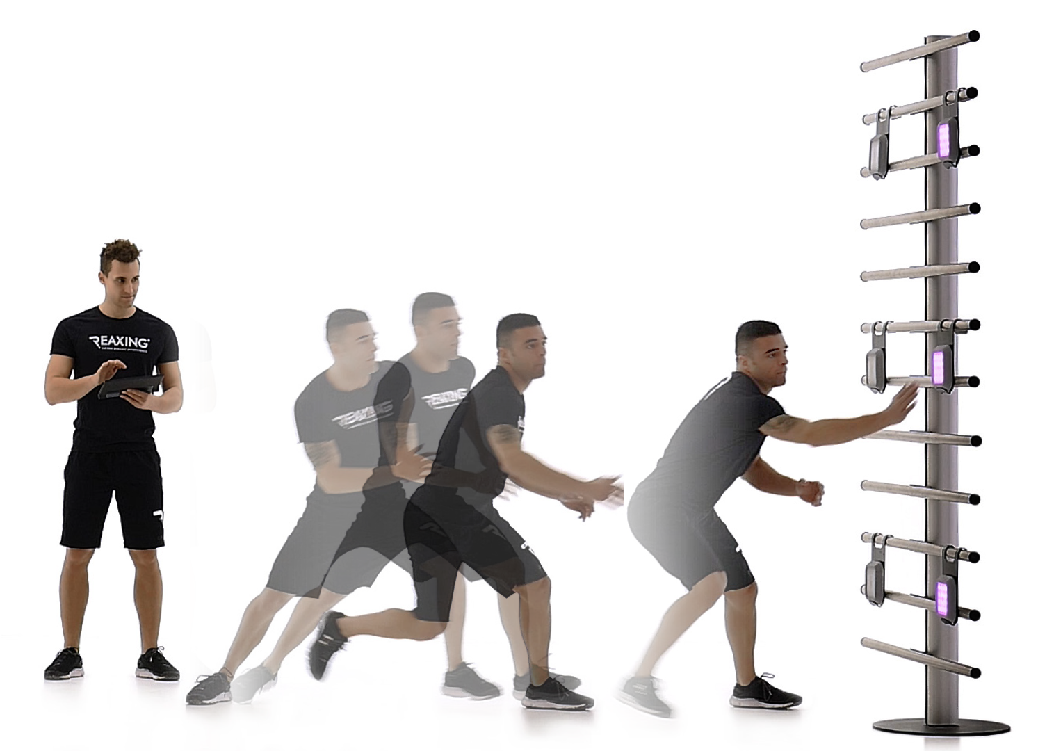 A wireless LED light system, created to make any workout session interactive, training the responsive ability through visual and sudden stimulations. Flexible, versatile, full of accessories, each light is equipped with magnets for a rapid connection to multiple surfaces. The WIFI tablet controller enables the trainer and the user to choose customized training programs by using Reaxing sudden dynamic interferences, the only technology capable of unpredictably alter the motor gesture.
