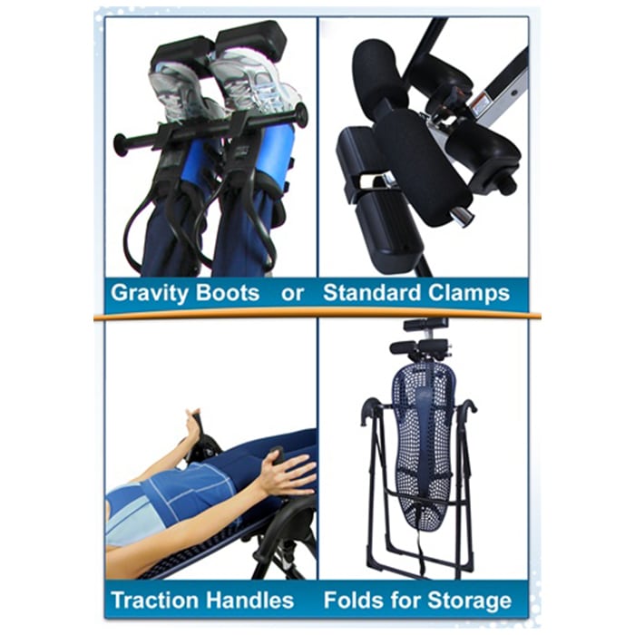 - Gravity Boots: Use your Gravity Boots with the table or take them to the gym; great for inverted sit-ups and squats.?The Gravity Boots wrap comfortably around each ankle, securing with adjustable, self-locking ratchet buckles. Super-soft 5/8? foam liners are a special blend to give maximum comfort with minimum compression.?ade of light, highly durable DuPont material for a comfortable fit